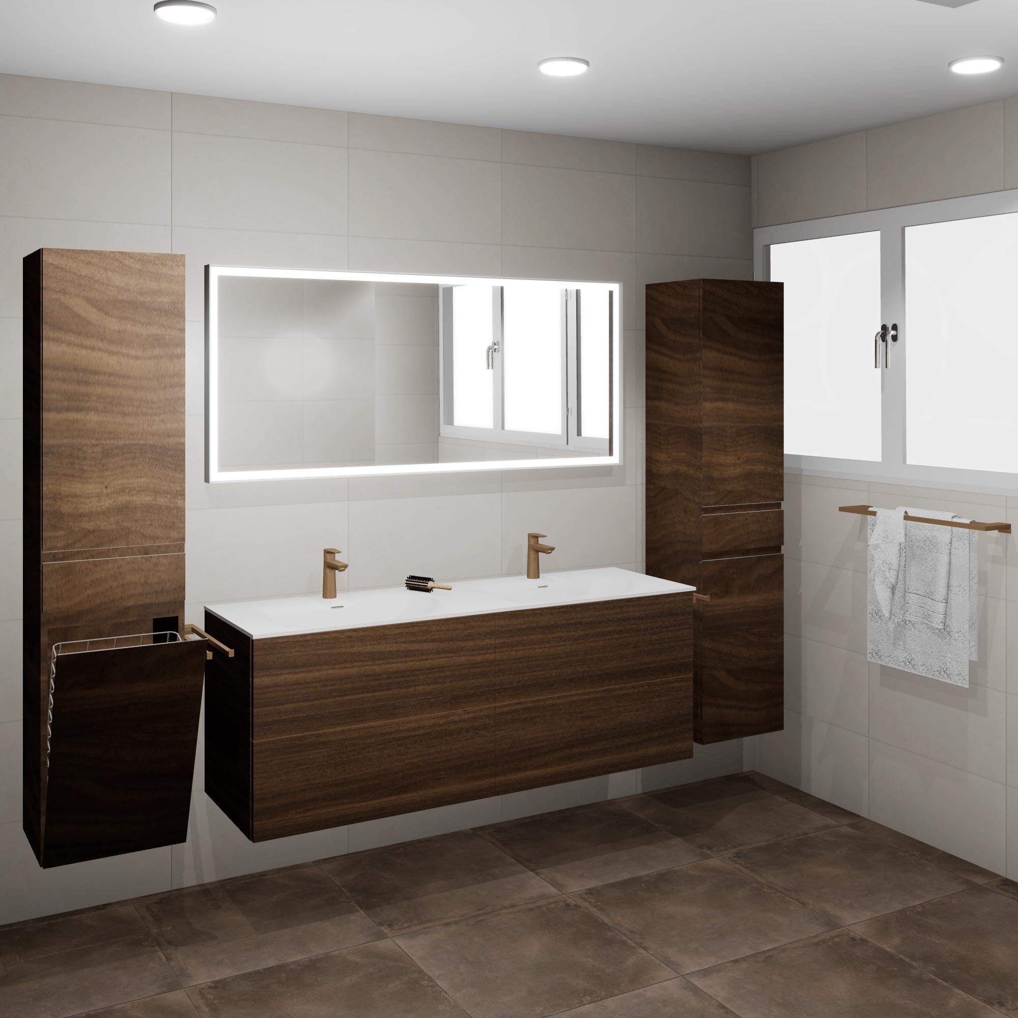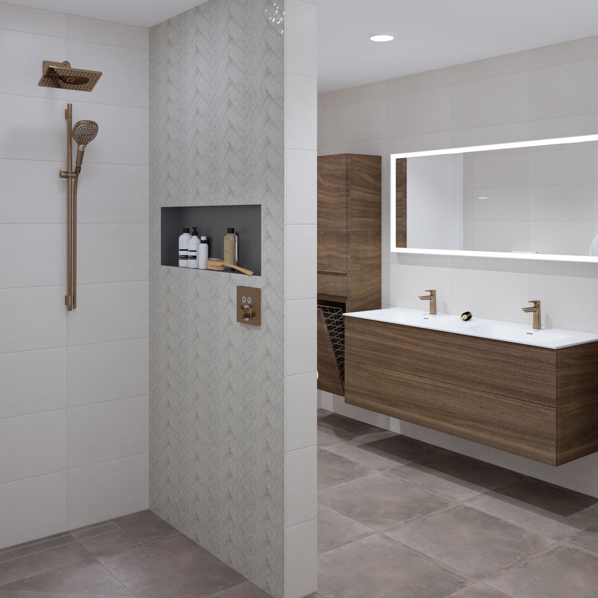 Ze vonden het erg moeilijk om deze grote ruimte functioneel in te richten zonder dat de ruimte benut werd. Zo is de wasmand in de hoge kast verwerkt, zo heb je nooit meer een losse wasmand dat zorgt voor een rommelig beeld. Daarnaast creëer je extra veel opberg ruimte en een rustig beeld door de symmetrie.