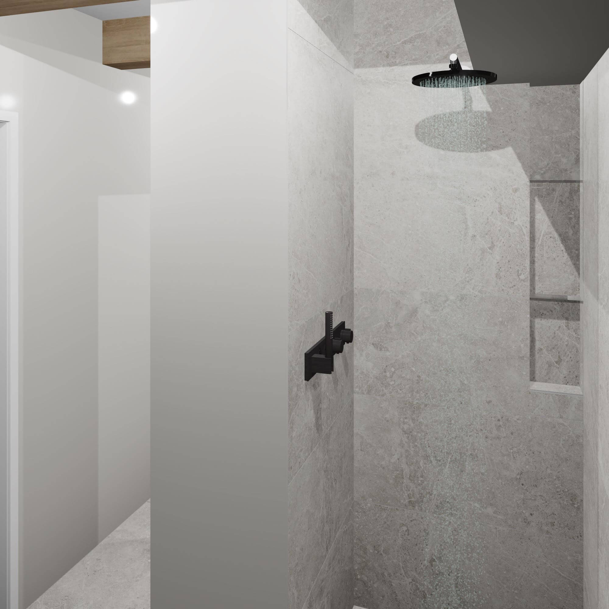 De ruimte was al voorzien van prachtige houten balken. We hebben de balken geaccentueerd door te kiezen voor een blank houten badmeubel en wandkast. De wandkast is op maat gemaakt en heeft een open vak om de ruimte te breken. Benieuwd naar de gehele ruimte? Bekijk dan snel de badkamer in 3D.