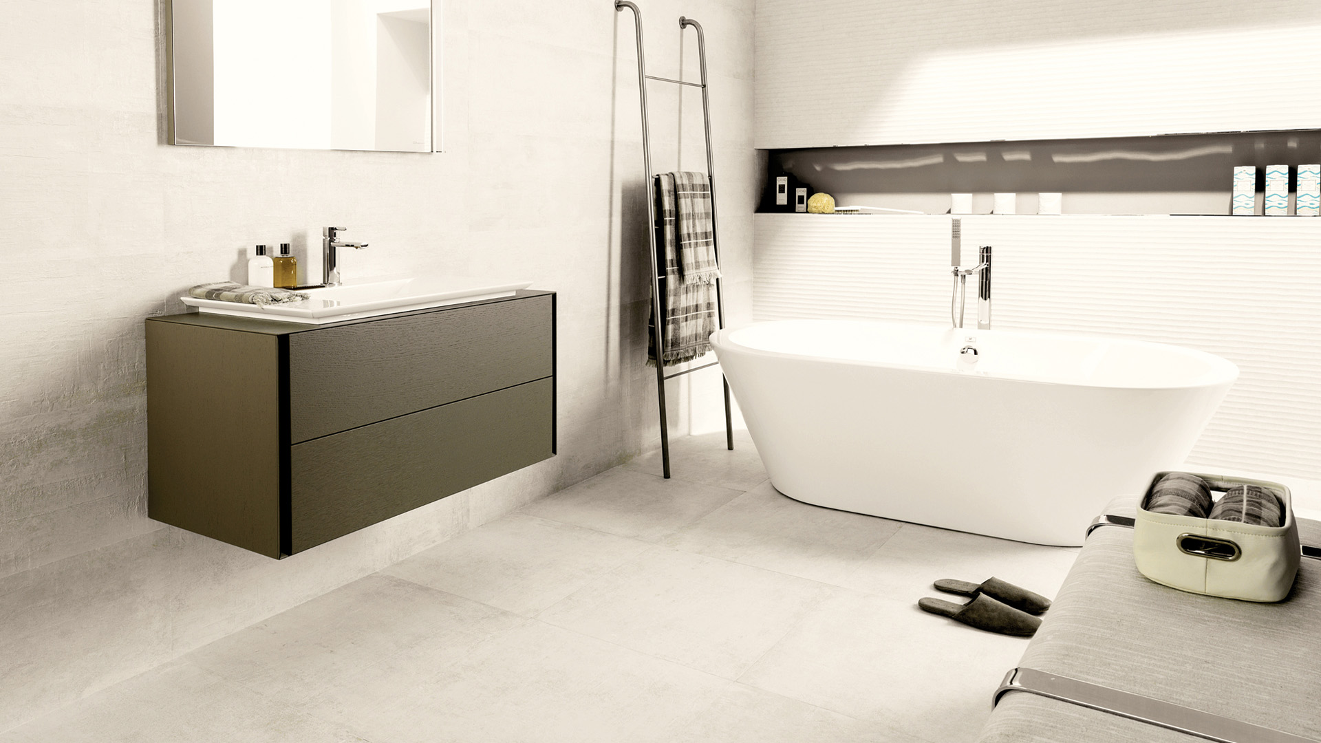 De White vloertegel combineert de stoere uitstraling van beton met een elegante, gesatineerde afwerking. Uitgevoerd in een frisse witte tint en met het formaat van 60x60 cm zorgt deze tegel voor een moderne en ruimtelijke uitstraling. Dankzij de gerectificeerde randen kan de tegel strak gelegd worden met smalle voegen.