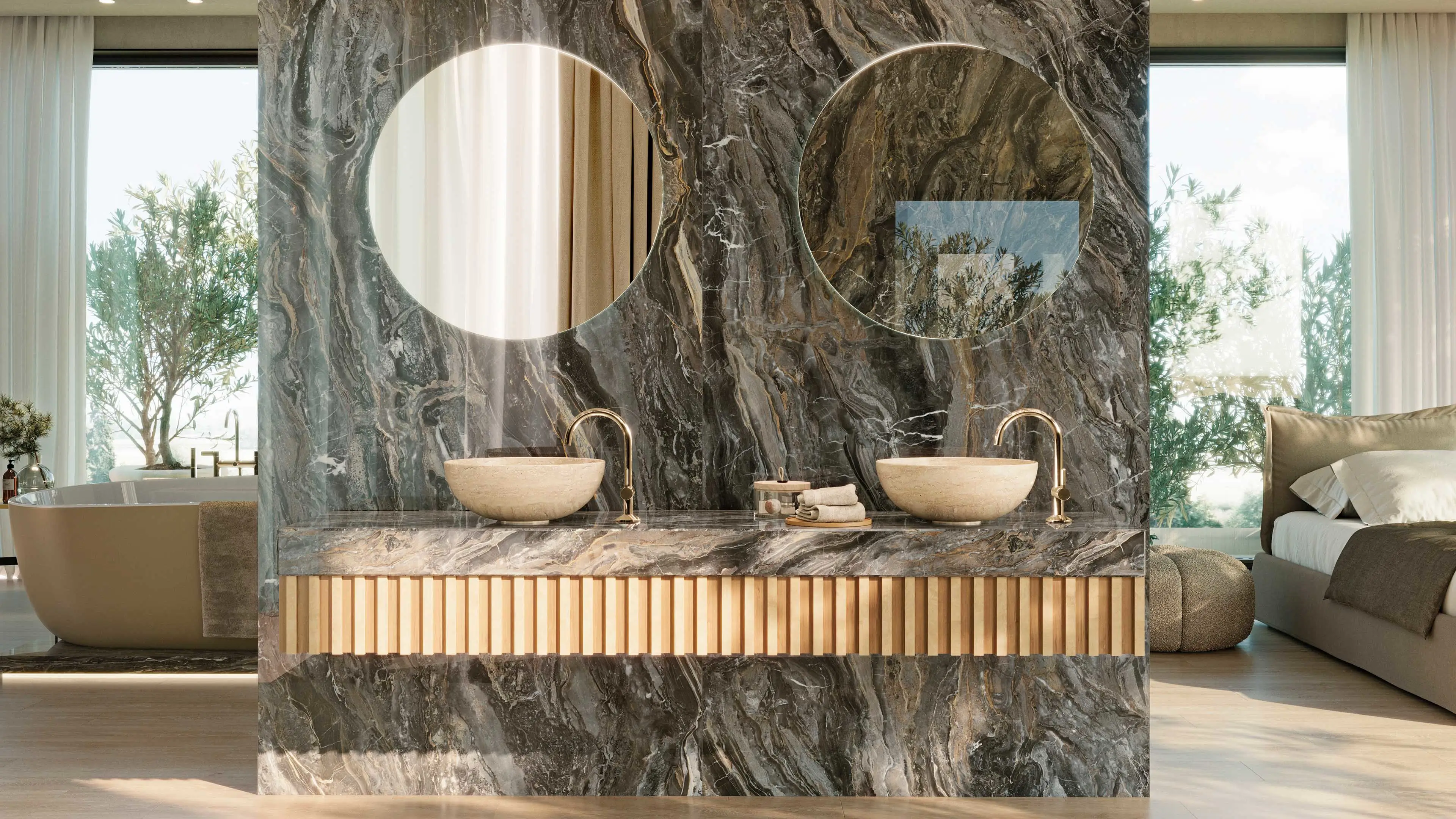 De Porcelanosa Orobico Dark is een elegante vloertegel met een luxe marmerlook in diepe bruintinten. De glanzende afwerking geeft iedere ruimte een rijke en stijlvolle uitstraling.
